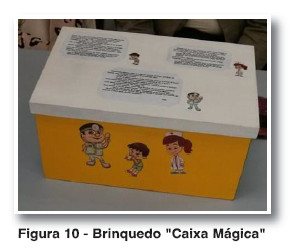 Brinquedo "Caixa Mágica" (Figura 10): trata-se de uma caixa personalizada, que possui uma série de materiais e instrumentos de trabalho da enfermagem (estetoscópio, termômetro, seringas, etc.) e fantoches (a Enfermeira e o "Doutô"). Em sua tampa é contada uma estória que envolve uma criança, uma enfermeira e um médico. Na brincadeira, a criança deve ser estimulada a ler a estória, conforme seu nível de alfabetização, ou o profissional realiza a leitura. Posteriormente, a caixa é aberta para que a criança possa conhecer e manusear os materiais, contando sua própria história com a utilização dos fantoches que estão na caixa. É aplicável dos 3 aos 7 anos de idade. A duração varia conforme a ação do profissional e a necessidade do infante (média de 30 minutos).