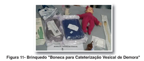 Brinquedo "Boneca para Cateterização Vesical de Demora" (Figura 11): é um brinquedo instrucional, que tem por objetivo instruir a criança quanto ao procedimento de cateterização vesical de demora. Na brincadeira, o profissional explica sobre a cateterização e estimula a criança a manusear os materiais e realizar o procedimento na boneca. Quando o cateter vesical é inserido na boneca, flui um líquido para dentro da bolsa coletora (representando a urina). Recomenda-se que a sessão dure de 20 a 40 minutos, sendo aplicada para crianças de 5 a 10 anos.