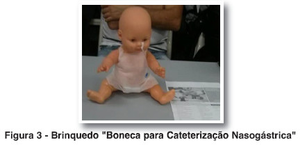 Brinquedo "Boneca para Cateterização Nasogástrica" (Figura 3): constitui-se de uma boneca com orifícios nas narinas que possibilitam a passagem de uma sonda nasogástrica, uma sonda gástrica e outros materiais utilizados no procedimento. Ao brincar com a criança, o enfermeiro mostra o brinquedo, realiza o procedimento na boneca e, posteriormente, oferece à criança para repetir a ação. Após a brincadeira, propõe à criança que o deixe realizar o procedimento nela. É um brinquedo instrucional, que tem por objetivos: proporcionar uma relação de confiança entre a criança e o enfermeiro; diminuir as tensões do infante, relacionadas ao procedimento ao qual será submetido; e orientar a criança e seus familiares sobre o procedimento de cateterização nasogástrica. Sugere-se seu uso para crianças de 5 a 10 anos de idade, com o tempo de aplicação de 15 a 45 minutos.