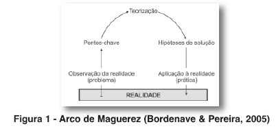 Nessa experiência foi utilizada a Problematização, que se fundamenta na pedagogia libertadora de Paulo Freire, nos princípios do materialismo histórico-dialético e no construtivismo de Piaget, tendo como referência o Arco de Charles Maguerez (Figura 1) (Alves, 2003; Bordenave & Pereira, 2005). Essa metodologia consiste em cinco etapas: 1. Observação da realidade; 2. Pontos-chave; 3. Teorização; 4. Hipóteses de solução; 5. Aplicação à realidade – Prática (Bordenave & Pereira, 2005).