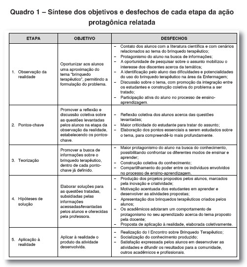O curso de enfermagem da instituição de ensino superior onde se deu esta experiência não adota metodologias ativas em seu currículo. Contudo, oferece liberdade aos docentes para desenvolverem suas disciplinas conforme o modelo pedagógico que acreditam e seguem. A professora responsável pela disciplina sempre teve como princípio norteador de sua prática docente a pedagogia crítica e faz uso da estratégia da Problematização com o Arco de Maguerez desde o ano de 2008. O tema BT foi inserido pela professora no plano de ensino da disciplina no segundo semestre de 2013, integrando a Unidade V, sob o título "O Brinquedo na Assistência à Saúde da Criança", tendo como subunidades: a importância do brincar para a criança; brincar no contexto da assistência à saúde; características e funções do brinquedo; o brinquedo no preparo para procedimentos diagnósticos e terapêuticos; o brinquedo terapêutico no contexto da assistência à saúde. Durante o desenvolvimento da temática foram aplicadas as cinco etapas do Arco de Maguerez, em oito encontros (Alves, 2003; Bordenave & Pereira, 2005). A iniciativa de ensinar sobre o BT, fundamentando-se na Problematização, repercutiu em desfechos muito positivos, como apresentado no quadro abaixo.