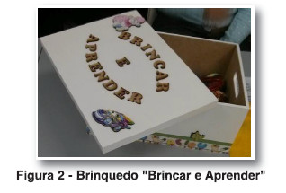 Brinquedo "Brincar e Aprender" (Figura 2): trata-se de uma caixa intitulada "Brincar e Aprender", que contém em seu interior vogais plastificadas, um conjunto de bolinhas coloridas e imagens de objetos comumente utilizados na assistência de enfermagem, a saber: agulha, estetoscópio, abaixador de língua, seringa, óculos de proteção, entre outros. É um brinquedo instrucional, que tem como principal objetivo familiarizar a criança com os materiais utilizados pela enfermagem, aproximando-a dos profissionais. Visa preparar a criança para os procedimentos de ausculta, aplicação de injeção e verificação de sinais vitais. O tempo proposto para sua aplicação é de 15 a 20 minutos, para crianças de 3 a 5 anos. Os tipos de atividades envolvidas na sua implementação são: motora, recreativa e estimuladora.