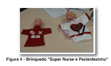 Brinquedo "Super Nurse e Pacientezinho" (Figura 4): são dois fantoches, sendo que um representa uma enfermeira (Super Nurse) e o outro, a criança (Pacientezinho). Podem ser utilizados no preparo para qualquer procedimento de enfermagem, sendo que a criança pode trocar de papel com o profissional na aplicação do BT, facilitando uma comunicação terapêutica eficiente. A Super Nurse deve estimular a criança a manusear o Pacientezinho, orientando-a sobre o procedimento a ser realizado. Trata-se de um brinquedo dramático/catártico e instrucional, que objetiva permitir a descarga emocional da criança e prepará-la para os procedimentos aos quais será submetida. A faixa etária para o seu uso é de 4 a 6 anos de idade, numa sessão de 15 a 20 minutos. Os tipos de atividades envolvidas são: simbólica e recreativa.