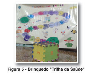 Brinquedo "Trilha da Saúde" (Figura 5): trata-se de um jogo constituído por um tapete de lona, que possui 25 casas, coloridas e com ilustrações. Cada casa tem uma atividade a ser realizada com a criança, sempre contendo informações sobre cuidados e procedimentos de enfermagem. Também possui um dado gigante em espuma vinílica acetinada (EVA), colorido, constituído por seis lados numerados sequencialmente. Neste brinquedo propõe-se à criança jogar o dado e avançar nas casas, conforme os números sorteados. Durante o percurso, o infante será convidado a realizar a dramatização de papéis. A modalidade deste brinquedo é dramática/catártica e instrucional, tendo como objetivos: preparar crianças hospitalizadas para procedimentos de enfermagem; aproximar a criança da enfermagem; e aliviar tensões. Pode ser aplicado a crianças a partir de 6 anos de idade e a adolescentes até 12 anos, sendo necessários 15 a 45 minutos. Os tipos de atividades envolvidas são: socializadora e dramática.