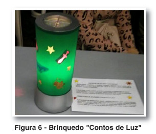 Brinquedo "Contos de Luz" (Figura 6): é uma luminária giratória com recortes em forma de estrelas e animais que vem acompanhada de uma estória sobre uma criança internada que apresenta muitas dúvidas. Para sua aplicação, o ambiente deve permanecer com penumbra e a música pode ser utilizada. Trata-se de um brinquedo catártico, que objetiva: auxiliar a criança a enfrentar a internação de maneira menos traumática; amenizar o sofrimento da criança e acalmá-la; e liberar tensões antes de procedimentos. Pode ser aplicado a crianças de 2 a 7 anos de idade, por um tempo de 20 a 30 minutos.