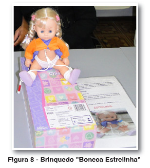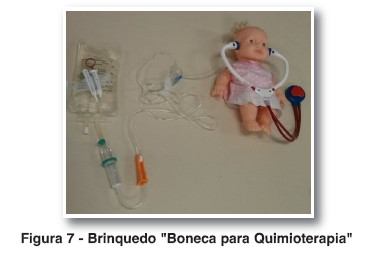 Brinquedo "Boneca para Quimioterapia" (Figura 7): trata-se de uma boneca com um cateter totalmente implantado, que tem por objetivo preparar crianças pré-escolares para submissão à quimioterapia, visando diminuir o estresse e o desgaste físico e emocional da criança e da família. É um brinquedo instrucional, que deve ser aplicado antes da quimioterapia. Na brincadeira, a criança é convidada a manusear materiais e a dramatizar o procedimento, podendo assimilar melhor a situação que será vivenciada. Pode ser aplicado de 15 a 20 minutos.