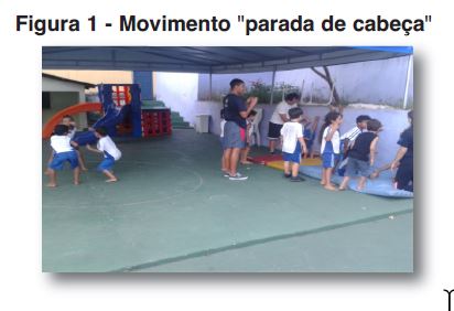 Essa negociação faz parte de um conjunto de "transgressões" das crianças, recorrentes no trabalho com a capoeira. Um desses episódios ocorreu quando algumas crianças do Grupo VI vivenciaram, de modo peculiar, o movimento da "parada de cabeça", conforme mostra a Figura 1: