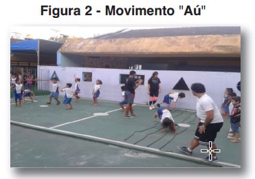 (...) durante a realização do Aú, embora muitos fizessem conforme as orientações dadas, algumas crianças disseram para o professor: ‘Tio, eu já sei fazer’; ‘Tio, eu sei dar estrelinha’. Nesse momento, duas crianças pediram à bolsista de ID para realizar o movimento sem o auxílio das cordas. Assim que ela concordou, várias outras crianças acompanharam a dupla e passaram a fazer o Aú fora do espaço determinado. (Diário de campo, 13-10-2014)