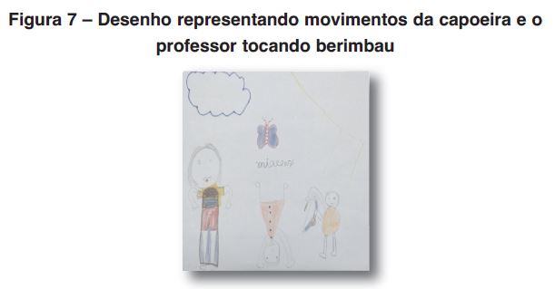 A vivência exposta nessas figuras se aproxima do conceito de experiência de Larrosa (2004). Para o autor, experiência é tudo aquilo que passamos, o que nos acontece, o que nos toca e deixa marcas. Com efeito, as experiências manifestadas pelas crianças materializam as sensações positivas que elas estão tendo com os elementos da capoeira. A partir do arcabouço simbólico e motor apreendido, as crianças passam a agir no mundo influenciadas pelos bens culturais, mediados pela escola.
