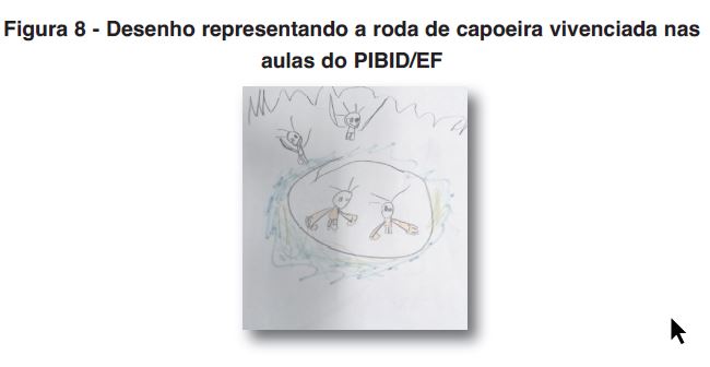 As crianças, ao cantarolar as músicas da capoeira, extrapolaram o que havia sido inicialmente pedido e, além de retratar imageticamente o conteúdo aprendido nas aulas de Educação Física, deram mais uma vez pistas de que existe uma relação de pertencimento, prazer e satisfação com essa prática corporal. Por meio dos desenhos, buscamos fomentar, junto às crianças do Grupo VI, sua autoria e, a partir dela, identificar os sentidos atribuídos às experiências vividas nas aulas mediadas pelos atores do PIBID/EF, bolsistas de ID e professor-supervisor.