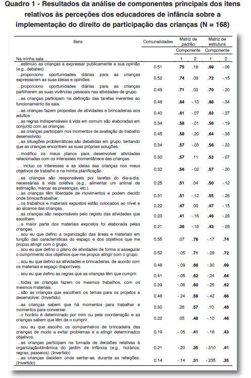 A análise de componentes principais permitiu identificar sete componentes com eigenvalues superiores a 1. No entanto, após a análise do scree plot e o cálculo de uma análise paralela (Patil, Singh, Mishra, & Donovan, 2007), constatou-se que uma solução de dois componentes era adequada. No decurso da análise de componentes principais e para interpretar melhor os componentes, foi realizada uma rotação oblíqua Oblimin, que convergiu após cerca de 60 iterações. De forma sequencial, foram eliminados quatro itens (...as crianças escolhem os parceiros de brincadeira; ...as crianças são informadas acerca das atividades planeadas por mim; ...as crianças escolhem os materiais utilizados nas atividades; ...defino o plano de atividades em conjunto com as crianças) que contribuíam de forma idêntica para ambos os componentes ou que não contribuíam para nenhum componente, até à obtenção da solução final, apresentada no Quadro 1.