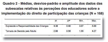 No caso da subescala Tomada de Decisão pelo Adulto, foram identificados três itens que contribuíam negativamente para o componente e que, por isso, foram invertidos na solução final. As estatísticas descritivas das componentes ou subescalas relativas às perceções dos educadores sobre a implementação do direito de participação das crianças figuram no Quadro 2. A média das respostas à subescala Tomada de Decisão pelo Adulto indica que, de um modo geral, o peso dos adultos na tomada de decisão é moderado. As perceções sobre a Expressão e Responsabilidade das Crianças apresentaram médias elevadas, indicativas que os educadores participantes consideram que as crianças têm liberdade de expressão e podem ser responsáveis por tarefas diárias.