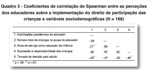De modo a verificar a direção e magnitude das associações entre os dois componentes obtidos neste estudo e entre estes e determinadas variáveis sociodemográficas, foram calculados coeficientes de correlação de Spearman, uma vez que a maioria das variáveis em análise apresentava distribuição não normal. No Quadro 3, é possível verificar a existência de uma associação positiva, estatisticamente significativa, entre as perceções sobre a Expressão e Responsabilidade das Crianças e o número total de crianças no grupo do educador, bem como uma associação negativa, estatisticamente significativa, entre as perceções de Tomada de Decisão pelo Adulto e as habilitações académicas do educador de infância. Finalmente, apurou-se uma associação negativa moderada, estatisticamente significativa, entre as perceções de Tomada de Decisão pelo Adulto e as perceções relativas à Expressão e Responsabilidade das Crianças.