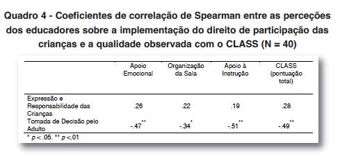 No Quadro 4, são apresentadas as correlações entre as subescalas relativas às perceções dos educadores sobre participação e os resultados relativos à qualidade observada nas salas, avaliada com base no CLASS. Foram considerados apenas os dados dos educadores que responderam ao inquérito e foram, simultaneamente, observados em contexto de sala (N = 40). Recorreu-se ao coeficiente de correlação de Spearman, uma vez que a maioria das variáveis apresentava distribuição não normal. Apenas foram apuradas associações estatisticamente significativas, negativas e de intensidade moderada, entre os três domínios e a pontuação total do CLASS e a subescala relativa às perceções de Tomada de Decisão pelo Adulto.