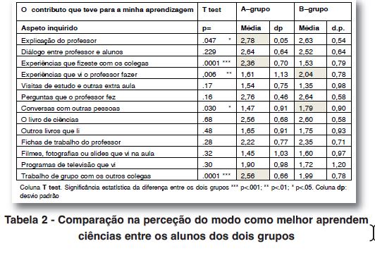 Na tabela 2 apresentam-se os resultados obtidos em cada um dos itens do instrumento "Perceção pelos alunos do ensino praticado" (anexo 3) para os alunos dos professores do grupo "construtivista" (coluna A) e do grupo "transmissivo" (coluna B). Estes dois grupos diferem (de modo estatisticamente significativo com a utilização do teste T de Student) na perceção da ênfase de um certo número de parâmetros pedagógicos no modo como aprendem ciências. Na coluna T test indica-se a probabilidade calculada de que as populações difiram significativamente. A indicação do desvio padrão (colunas dp) permite apreciar a dispersão de resultados para cada item e grupo. Os alunos do grupo "construtivista" sentem mais do que os do grupo "transmissivo" o contributo da apresentação do professor, das experiências que os alunos efetuam e do trabalho em grupo com os colegas. Demonstrações feitas pelo professor e a necessidade de recorrer a outros são mais sentidas pelos alunos do grupo "transmissivo".