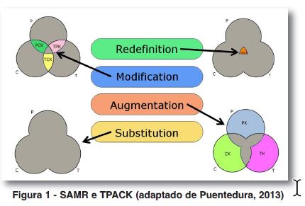 Puentedura (2013) desenvolveu o modelo ‘Substitution, Augmentation, Modification, Redefinition’ (SAMR), que evidencia a transição entre os diferentes níveis de integração da tecnologia na sala de aula. Os dois primeiros componentes deste modelo (Substituição e Aumento) procuram a melhoria das atividades de aprendizagem com o uso das TIC, os outros dois componentes (Modificação e Redefinição) já têm o propósito de transformar, com o uso das TIC, as atividades de aprendizagem propostas pelos docentes. Pode-se estabelecer um paralelo entre o modelo SAMR e o referencial TPACK (figura 1). No caso particular da tecnologia quadro interativo, no nível da Substituição, o quadro interativo é usado apenas como um mero recurso, em substituição de outro e sem trazer qualquer melhoria funcional à sala de aula. Por exemplo, como uma tela branca. Não se enquadra no referencial TPACK. No nível do Aumento, já ocorre uma melhoria funcional da tecnologia, mas ainda sem transformação. Por exemplo, já se realizam anotações no quadro interativo e manipulam-se recursos, acrescentam-se páginas e guardam-se as aulas… São necessários diferentes conhecimentos, mas ainda não apresenta nenhum conhecimento proveniente das várias interseções do referencial TPACK. No nível da Modificação, o quadro interativo já permite redesenhar as atividades de aprendizagem para ocorrer transformação na aprendizagem dos alunos. Por exemplo, usa-se a galeria de imagens e as ferramentas interativas que vêm com o software do quadro interativo. Vários dos recursos escondidos na galeria podem transformar as aulas. A forma de assimilação do conteúdo por parte dos alunos muda. Assim, as interseções de conhecimento do referencial TPACK são necessárias para o professor redesenhar as atividades. Por fim, no nível da Redefinição as tarefas propostas aos alunos com o uso do quadro interativo já permitem a transformação da capacidade de pensamento de ordem superior. Por exemplo, são criadas questões para os alunos responderem no decorrer da aula em que o professor e/ou a turma sabe(m) de imediato quem respondeu corretamente. Há uma efetiva transformação de atitude na sala de aula. Deste modo, a interseção de todos os tipos de conhecimento manifesta-se, estamos perante o TPACK.