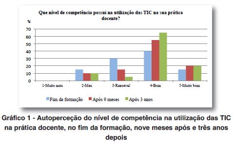 Constatou-se que ocorreu uma evolução na integração das TIC na prática docente, sendo que no fim da formação 35% dos professores consideravam que não utilizavam as TIC de forma eficiente nas suas aulas, diminuindo para 25% quer passados nove meses quer decorridos três anos. O desenvolvimento profissional dos professores envolve um processo contínuo de melhoria de práticas com o intuito de se promoverem mudanças educativas que visem a melhoria da qualidade de ensino e "concretiza-se com uma atitude permanente de pesquisa, de questionamento e de busca de soluções" (Garcia, 1999, p. 137). Além disso, deve ser visto como um processo e não como um simples evento (Loucks-Horsley, Hewson, Love, & Stiles, 1998).