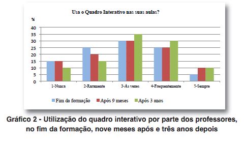 Mouraz e Sousa (2011) analisaram os resultados do projeto Inovar com QI, que se desenvolveu ao longo de três anos, e apuraram que o uso do quadro interativo nas aulas era uma constante, mas apenas metade usava ferramentas próprias do quadro interativo e cerca de um terço dos professores preparava as suas atividades específicas para usar com o quadro interativo. A "integração [do quadro interativo] existiu e foi sendo progressivamente mais diversificada, tanto quanto a sensação de familiaridade dos professores com a tecnologia e a progressiva exigência dos conteúdos a leccionar foi estimulando" (Mouraz & Sousa, 2011, p. 84). Guimarães e Carvalho (2011) analisaram a reação de três grupos de professores de Matemática e Ciências da Natureza que frequentaram formação em quadros interativos no âmbito do Plano Tecnológico da Educação (PTE) e concluíram que a formação teria sido mais vantajosa se fosse na modalidade de oficina, tendo realçado a importância de acompanhar ao longo do tempo os professores que receberam formação para verificar o seu impacto nas práticas letivas. Num estudo mais amplo, Guimarães e Carvalho (2012) já analisaram a reação de dezanove grupos de professores que frequentaram essa formação e concluíram que passado um ano poucos professores adotavam o quadro interativo como ferramenta pedagógica, não conseguindo coordenar o conhecimento do conteúdo com o pedagógico e o tecnológico.