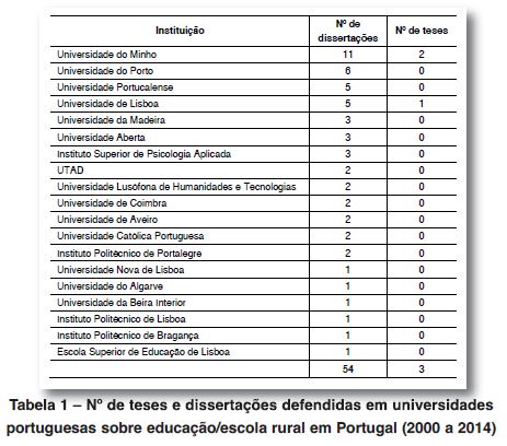 O levantamento mostra que nos últimos quinze anos apenas 0,98% dos trabalhos acadêmicos em nível de mestrado e 0,58% em nível de doutoramento no campo das Ciências da Educação lançaram o olhar à situação da educação ou da escola instalada no meio rural português. A Universidade do Minho, com 11 dissertações e 2 teses, e a Universidade do Porto, com 6 dissertações, foram as instituições onde mais produções acadêmicas voltadas à educação/escola rural foram defendidas no período.