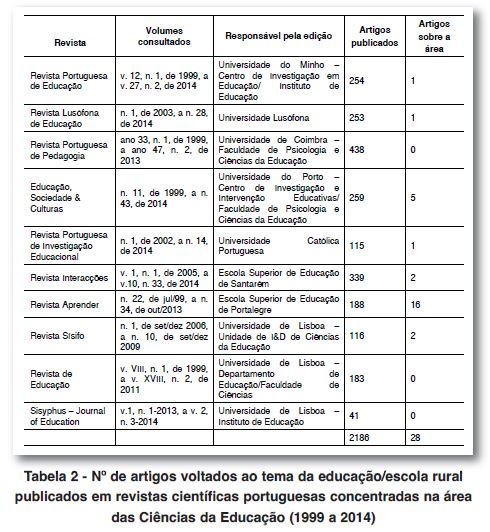 Contudo, desprovida de um debate acadêmico que a perceba como protagonista no cenário rural, a escola pouco irá contribuir com os que, endógena ou exogenamente, enfrentam a crise que há muito atinge aquele território. Nesse sentido, uma amostra do distanciamento da academia da discussão que abrange a escola e a educação no meio rural pode ser verificada no levantamento realizado junto às principais revistas científicas na área das Ciências da Educação editadas por instituições acadêmicas portuguesas, disponíveis em formato digital ou impresso. Nele foi possível encontrar 2.186 artigos, dos quais apenas 28 apresentam uma discussão relacionando mais diretamente à educação/escola e a realidade do mundo rural português, o que equivale a 1,28% de todas os artigos publicados em mais de uma década e meia (tabela 2).