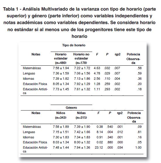 Se observan diferencias significativas en las notas de matemáticas y lenguas. Los niños en que al menos uno de sus padres sigue una jornada laboral estándar obtienen mejores notas que aquellos otros en que ninguno de los dos progenitores tiene una jornada laboral estándar (parte superior de la Tabla 1). Así mismo, también se observan diferencias significativas ligadas al género en las materias de Lenguas y Educación Artística, siempre favorables a las niñas (parte inferior de la Tabla 1). La interacción entre género y tipo de horario solamente se ha observado significativa en la materia de Educación Artística.