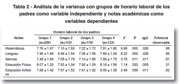 Se realizó un análisis multivariante de la Varianza (MANOVA) y un análisis univariado de la Varianza (ANOVA); en ambos casos la variable dependiente era la nota obtenida en las materias evaluadas; mientras que los factores fueron, para el MANOVA, el horario laboral de los progenitores (estándar o no estándar) y el género de los hijos; mientras que para el ANO-VA, el horario laboral de los progenitores (cuatro grupos de combinaciones del horario del padre y de la madre). De todos los análisis efectuados se obtuvo el valor Eta al cuadrado parcial (ηp2) como medida del tamaño del efecto, considerando que una Eta al cuadrado parcial de .01 es pequeña, de .04 es moderada, y de .1 es grande (Huberty, 2002). Además se realizó un análisis de regresión lineal tomando como variables predictoras el número de horas de trabajo a la semana, la hora de finalización de la jornada laboral de ambos progenitores y el género de los hijos. Se tomaron como variables criterio sólo las que resultaron significativas en los análisis de la varianza. Los cálculos se realizaron con el paquete estadístico SPSS/PC+ (Versión 21.0) y los tests estadísticos fueron bilaterales con error tipo I variable al 5%.