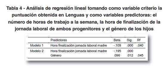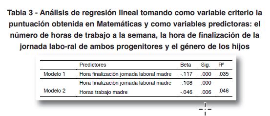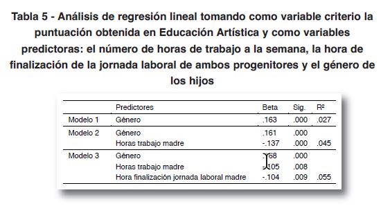 El análisis de regresión lineal muestra que la variable que mejor predice el rendimiento académico en Matemáticas, Lenguas y Educación Artística es la hora de finalización de la jornada laboral de la madre, añadiéndose, en el caso de las Matemáticas, la variable horas de trabajo de la madre; mientras que en Lenguas y Educación Artística aparece la variable género. A pesar de la significación estadística del efecto, la cantidad de varianza explicada, tal como indican los índices R2, es muy moderada: con un máximo de 5,5 % de varianza explicada.