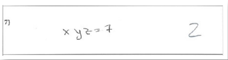 En la Figura 2 el sujeto identifica tres de las cuatro variables y sólo una de las dos operaciones implicadas. Si bien su respuesta parece no tener sentido, interpretamos que el sujeto moviliza, al menos hasta cierto punto, la propiedad consistente en que un número primo divide a un producto si, y solo si, divide a alguno los factores, así como que el 7 es primo. Al mencionarse la divisibilidad en el enunciado interpretamos que el sujeto la tiene en cuenta y que el error proviene de falta de dominio del lenguaje algebraico.