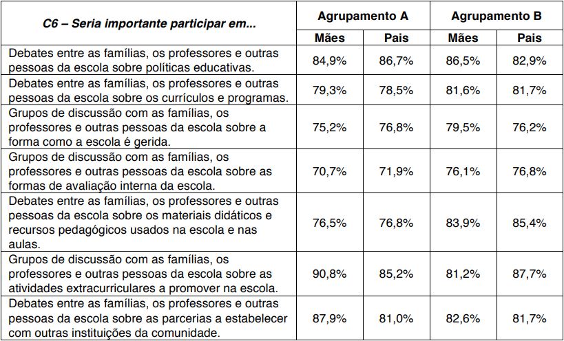 A eventual participação em debates e discussões nas escolas, envolvendo as famílias, os docentes e outras pessoas da escola, é também algo que, à partida, é considerado relevante por todos os participantes. De tal modo que, por exemplo, nos questionários para mães e pais, não só não foram encontradas diferenças estatisticamente significativas nas principais variáveis em relação à dimensão C6, como, de facto, as mães e os pais revelaram um sentido geral de concordância com todos os itens, como se pode observar no Quadro 1.