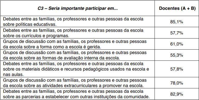 Não obstante todos estes problemas, existem representantes das famílias com vontade de inscrever a sua voz na vida escolar (cf. Sousa, 2012), apoiar o trabalho dos docentes e apoiar outras famílias. E também existe entre alguns docentes a ideia de que a participação das famílias poderia ser mais ativa, embora surjam igualmente com demasiada facilidade as ideias estereotipadas do desinteresse e da incompetência das famílias (cf. Sá, 2004; Silva, 2003), algo que é mais evidente no Agrupamento B.