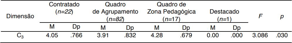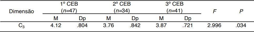 Ao contrário do que se passou com os pais e mães que responderam aos questionários, foram encontradas diferenças estatisticamente significativas (p<.05) na dimensão C3 quando consideradas as variáveis Nível de Ensino, Situação Laboral, Tempo de Serviço. Podemos observar essas diferenças nas tabelas que se seguem.