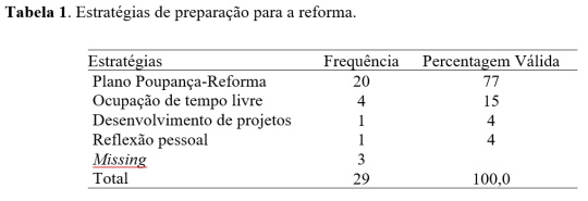 Verifica-se que a maior parte dos docentes não prepara a sua reforma (85 inquiridos; 74,6%) e os que o fazem (29 participantes; 25,4%) não recorrem a um processo de preparação psicológica ou de procura de centros de interesse motivacionais alternativos para o tempo da reforma, mas antes indicam estratégias externas limitadas a uma dimensão económica, as quais podem ser consultadas na Tabela 1.