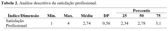 A análise descritiva dos dados permitiu averiguar que, em média, os docentes estão moderadamente satisfeitos com o seu trabalho (M=2,74) e que, apesar de existirem professores muito insatisfeitos (o mínimo verificado é 1), o mesmo não acontece com o oposto, ou seja, não existe nenhum docente muito satisfeito (dado que o máximo observado é 4, quando a escala apresenta uma amplitude de 5 pontos). O desvio-padrão não é acentuado (DP=0,56), pelo que se pode concluir que não existe uma dispersão significativa dos dados relativamente à média, o que é reforçado pela leitura dos percentis (Tabela 2).