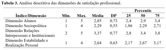 No que respeita às dimensões de satisfação profissional, a dimensão sociopolítica (condições de trabalho como salário, estatuto social e carga horária) é a que apresenta a média mais baixa (M=2,29; DP=0,53), ao passo que as relações interpessoais e institucionais (relação com os vários membros do contexto escolar) correspondem à dimensão com a média mais alta (M=3,37; DP=0,77) (Tabela 3).