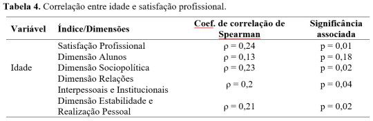 Apenas foi encontrada uma correlação positiva fraca entre a satisfação profissional e a idade dos participantes (ρ = 0,24), estatisticamente significativa (p <0,05). No entanto, quando analisadas as dimensões de satisfação profissional, constata-se que a correlação entre a idade e a dimensão alunos é positiva fraca (ρ = 0,13) e não é estatisticamente significativa (p > 0,05), o que não acontece com as demais dimensões, onde existe uma associação positiva fraca e estatisticamente significativa (Tabela 4).