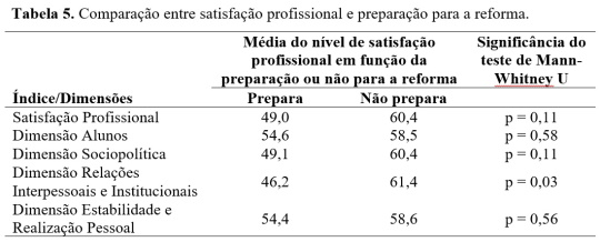 Quando se comparam as dimensões de satisfação profissional em função da preparação ou não para a reforma, verifica-se que existem diferenças estatisticamente significativas entre a preparação para a reforma e a dimensão das relações interpessoais e institucionais, sendo que os professores que não preparam a sua reforma são os que apresentam níveis mais elevados de satisfação (Tabela 5).