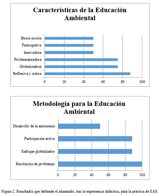 Un fin básico de la propuesta didáctica llevada a cabo era que el futuro profesorado vivenciase modelos alejados de la predominante práctica educativa transmisiva (Eames et al., 2006) y se cuestionase la reproducción de modelos de enseñanza tradicionales. El análisis de la propuesta realizado muestra que los equipos de futuros docentes defienden que la EAS debe ser reflexiva y crítica, globalizadora y problematizadora (ver figura 3), asociándola con características propias del enfoque que defiende la EAS actual. También relacionan su práctica con la resolución de problemas ambientales, el enfoque globalizador, la participación activa y el desarrollo de la autonomía (ver figura 3). Estos resultados coinciden con los datos que aportan tanto la escala de actitudes como las entrevistas.
