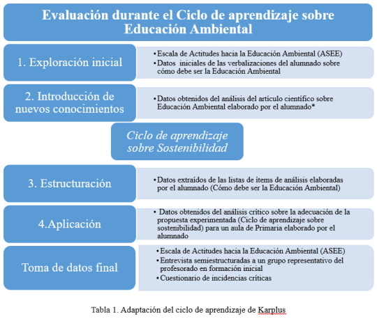 Para ello, se trataron, por una parte, cuestiones relacionadas con la sostenibilidad y, por otra, la forma de entender la EAS del futuro profesorado, de manera que estas dos dimensiones estuviesen interrelacionadas e integradas. El planteamiento se basó en el ciclo de aprendizaje de Karplus (Karplus, 1977), aunque adaptado a las concepciones antedichas (ver Figura 1).