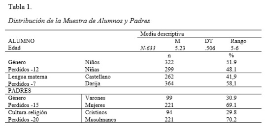 La unidad muestral seleccionada para este estudio estuvo centrada en el alumnado de segundo ciclo de Educación Infantil y los padres de estos niños. Teniendo en cuenta para ello, una representatividad de los centros educativos (públicos y concertados) de este ámbito que pudiesen plasmar las peculiaridades multiculturales de la Ciudad Autónoma de Ceuta. El método utilizado para la elección de los sujetos del estudio se ha basado en la aplicación de un muestreo aleatorio, partiendo de las siguientes variables a la hora de hacer los estratos: lengua materna de los alumnos (castellano; darija) y cultura familiar (cristiano; musulmán). La muestra final, como se ve en la tabla 1, quedó integrada por 633 escolares que formaban parte de 15 centros educativos públicos y seis centros concertados y 335 padres de estos alumnos. La edad media de estos alumnos es de 5.23 (DT= .506); de estos, el 51.9% eran niños (.=322) y el 48.1% niñas (.=299), de los cuales el 41.9% tenían como lengua materna familiar el castellano (.=262) y el 58.1% el darija (.=364). En el caso de los padres, el 70.2% profesan el islam (.=221) y el 29.8% el catolicismo (.=94); de estos, el 69.1% son mujeres (.=221) y el 30.9% hombres (.=99).