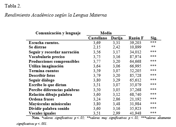 Según el primer objetivo de nuestro estudio, en la Tabla 2podemos observar los resultados del análisis de varianza para el área de comunicación y lenguaje, mostrando que existen diferencias en el rendimiento académico de todas las dimensiones lingüísticas en función de la lengua materna de estos alumnos. Unas discrepancias que arrojan valores más positivos en el caso del alumnado castellano-parlante, todos ellos con una alta significación (.<.001). En cambio, en el apartado de distraerse, los alumnos darijo-parlantes (musulmanes) tienen la media más alta (= 2.285; = .19), aunque este valor es negativo, dado que muestra como estos tienen menos facilidad para prestar atención y estar concentrado. Cuando calculamos las diferencias de medias entre cada grupo se observa que las mayores divergencias entre los castellano-parlantes y los darijo-parlantes se dan cuando se valora la capacidad de describir una foto (= 3.79; = .41), la utilización de un vocabulario preciso (= 3.75; = .41), y la comprensión de las producciones lingüísticas (= 3.77; = .4), todas ellas relacionadas con la expresión oral. En cambio, los valores más elevados de . >(3.84) vuelven a mostrar como la precisión del vocabulario (87.974), la descripción de fotos (85.728) y la relación dibujo-palabras (68.740) tienen un valor de . <.001.