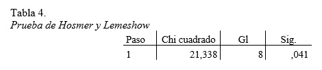En la Tabla4, la prueba de bondad de ajuste, llamada Hosmer y Lemeshow, al distribuirse con un nivel de significación mayor a .05 verificó que el modelo de los ítems elegidos es legítimo para poder crear una ecuación de Regresión Logística Binaria y así valorar si estos pronostican la influencia de la religión en los modelos familiares. En consecuencia, el .<.05= .041 de esta prueba se distribuye con un nivel de significancia que verifica que el modelo sigue siendo óptimo para la predicción de la cultura como variable principal de estas diferencias.