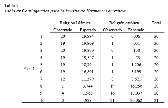 A continuación, la prueba anterior se prolonga en la Tabla 5 que nos permite realizar una valoración de la divergencia entre estas dos religiones con base en pronóstico observado y esperado. De tal manera que los valores observado y esperado para el grupo que profesa religión islámica tienen una ligera cercanía superior a los valores de los que profesan el catolicismo. Datos que permiten que las variables combinadas en la ecuación de regresión de manera significativa predigan en mayor grado a las familias de religión islámica.