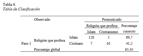 Del mismo modo, este modelo de ecuación logística valora un porcentaje de predicción global para la religión cristiana de un 41.2% y un 89.7% para la religión islámica, datos estadísticamente significativos con casi el 65.45% de acierto, valorando que predice mejor el caso de los musulmanes. Por ello, de las dos categorías del estudio de las variables combinadas en ecuación predicen una mejor valoración para las familias de cultura musulmana.