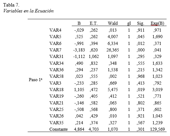 En la Tabla 7están representados los datos de las variables de la ecuación en particular a la hora de interpretar los datos de la Tabla 7 y en función de las variables con significación, el orden de las variables con mejor determinación representa la comunicación en el núcleo familiar (VR7), con un valor de significación de .000; la comunicación en el ámbito social (VR6), que presenta un valor de .011; los hábitos educativos (VR18), con un valor de .019; y el código lingüístico para expresar sentimiento (VR5), con un .045.