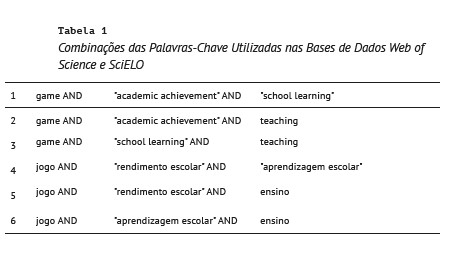 Foram excluídos da seleção os artigos de estudos que investigaram o uso de elementos de jogos sem usar jogos propriamente ditos (e.g., gamificação) como intervenção, que não avaliaram o desempenho acadêmico dos participantes e que investigaram a utilização de jogos em aulas de Educação Física. Esse último critério é justificado pela consideração da Base Nacional Comum (Ministério da Educação, 2015) sobre jogos serem atividades importantes para a saúde e entretenimento e não necessariamente serem instrumento de ensino de conteúdo formal. Publicações editoriais (por exemplo, apresentação dos artigos de um determinado volume), revisões de livros, discussões teóricas, apresentações em conferências, saudações, entrevistas ou homenagens também foram excluídas da revisão.