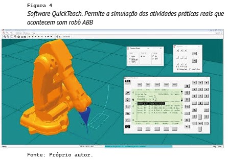 A mudança didática nessa parte foi enorme, pois excluiu-se o uso de apresentações expositivas com Datashow nas aulas. Partiu-se do pressuposto que todas as aulas deveriam ser práticas, mesmo a escola possuindo apenas dois braços manipuladores. A turma pesquisada possuía 37 alunos e são poucos robôs para cada aluno, portanto fez-se uso de um guia para acompanhamento do passo a passo de uso dos Programas QuickTeach da ABB, e KUKAsim (Figura 4).