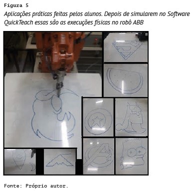 Desta forma, os alunos (em duplas formando equipas de trabalho) puderam realizar os seus projetos de desenho1 com os robôs (Figura 5), que é o conhecimento inicial para então aprender sobre sensoriamento na robotização (entradas e saídas digitais e analógicas), e assim concluir o seu trabalho na disciplina de robótica e manufatura flexível. Decorre que a função do professor nesta etapa é passar o conhecimento, sendo a prática e o desenvolvimento da responsabilidade dos alunos, que executam os seus projetos com criatividade, sentem-se realizados e motivados.