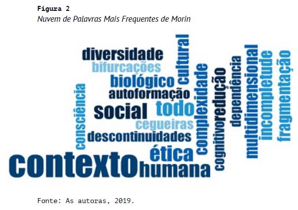 Em sua teoria, o autor apresenta contribuições significativas que interferem diretamente na docência. Do apanhado realizado nesta pesquisa, foi possível apresentar pontos/palavras (Figura 2) mais frequentes do pensamento complexo de Morin (1999, 2000).