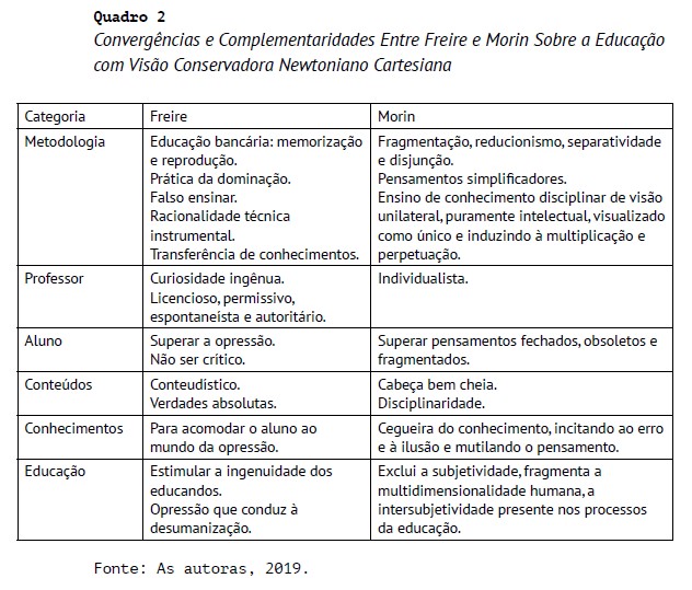 Na indicação de pontos convergentes e complementares presentes nas obras indicadas, foi possível perceber a urgência na superação da visão newtoniana-cartesiana, baseada na razão, na fragmentação e na simplificação (Morin, 2000) e que prega a separatividade e a disjunção, como proposto por Freire (1996) ao afirmar que é falso ensinar com uma visão da educação bancária. A convergência das ideias de Morin (1999) e de Freire (1996) se acentua na denúncia e na necessidade de estabelecer diálogos críticos que auxiliem na superação de sistemas que oprimem, que levam à cegueira do conhecimento, com pregação de verdades absolutas e inquestionáveis, incitando ao erro e à ilusão e mutilando a reforma do pensamento.