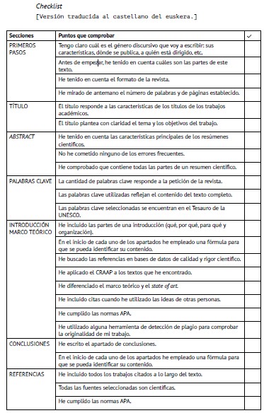 Después de las dos partes fundamentales de la propuesta, llega el momento de la fase de construcción independiente. El alumnado ya ha podido interiorizar las características del género discursivo y es momento de que aborde la escritura de un texto de esta naturaleza de manera autónoma. Para ayudar en esta labor, se presenta una checklist o lista de comprobación (ver Anexo I). El objetivo de esta herramienta es facilitar al usuario de la propuesta un instrumento para hacer una revisión final del texto producido. Al crear un texto académico es importante intentar cuidar todos los aspectos durante el proceso de creación, pero tan importante como eso es hacer una lectura global una vez finalizado el texto. Por dicho motivo, se ofrece una lista de interrogantes con la que el estudiante podrá comprobar la calidad de su trabajo. Esta herramienta favorece, además, el desarrollo de las habilidades para el aprendizaje autónomo de los aprendices (Boillos, 2017).